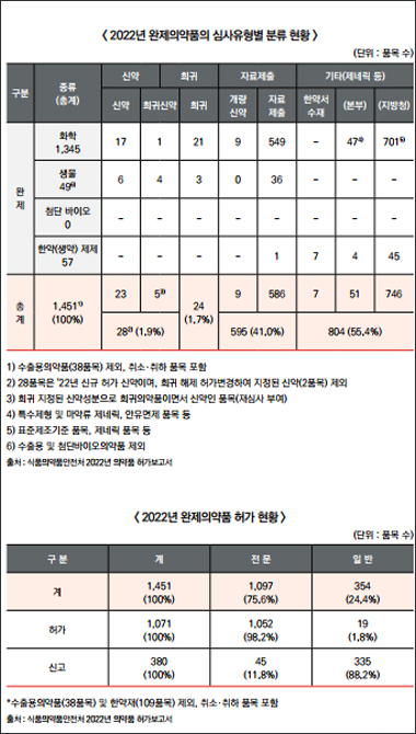 이런 수십 년의 의약품 개발 역사에도, 국내 합성의약품의 개발과 생산은 CMO(의약품 위탁생산) 및 CDMO(의약품 위탁개발생산) 기업을 중심으로 한 내수용 후발약(제네릭)과 일반의약품 등의 위·수탁이 과반을 차지하고 있다. 식품의약품안전처가 지난 4월 공개한 '2022년 의약품 허가보고서'에 따르면, 작년 허가·신고돼 있는 의약품 1451개 품목 중 완제 합성의약품은 1345개 품목(92.7%)으로 나타났다. 또 완제 합성의약품 중 신약, 희귀의약품, 자료제출의약품 등을 제외한 제네릭, 표준제조기준, 안유(안전성·유효성) 면제, 한약서 수재 유형의 의약품은 897개(55.4%) 품목으로 나타났다.