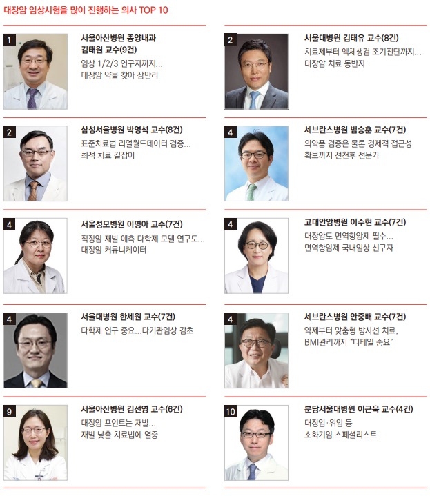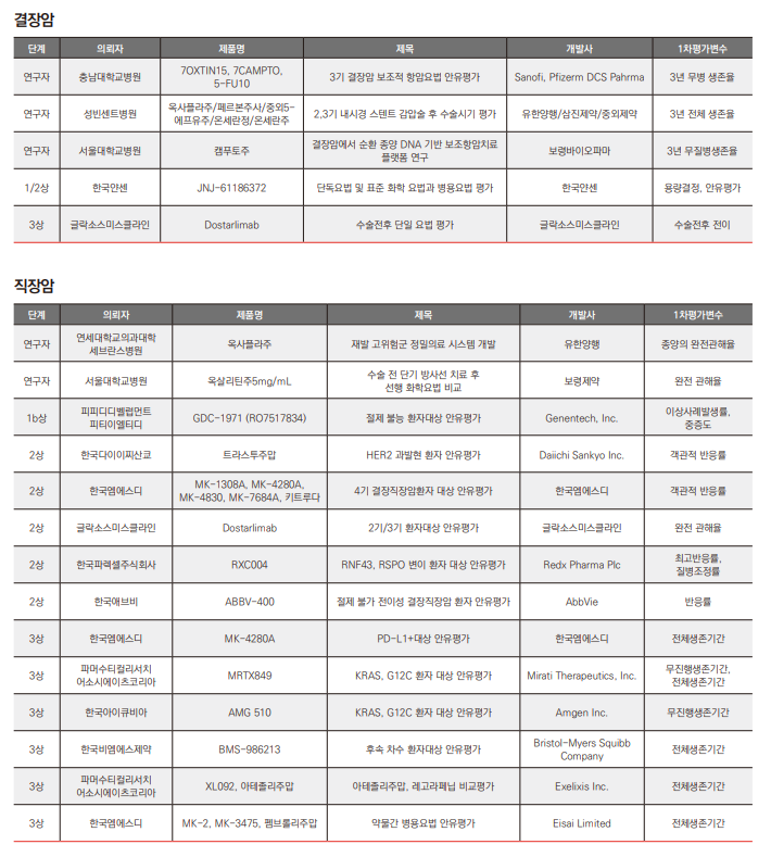 식품의약품안전처의 2020년 12월부터 2023년 12월까지 대장암, 직장암, 결장암 통계를 살펴보면, 가장 많은 임상시험이 이뤄지고 있는 시험기관은 연세대 세브란스병원(18건)과 서울아산병원(18건)으로 확인됐다. 2상 임상시험이 11건으로 가장 많이 이뤄지고 있다. 최근에는 병용요법 및 치료 기술 개발을 위한 연구자 임상(9건)이 활발히 진행되고 있으며, 임상 3상이 8건으로 뒤를 잇고 있다. 가장 많은 임상시험을 진행하고 있는 교수는 서울아산병원 혈액종양내과 김태원 교수로, 총 9건의 임상시험(2상 4건, 3상 5건)을 맡고 있다.