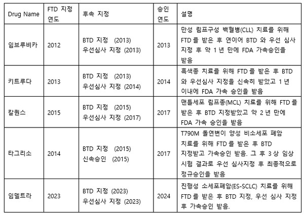 FDA는 이 제도를 통해 신약이 더 빨리 시장에 출시되어 환자에게 제공되도록 전폭적으로 도움을 주어 승인에 이르기까지 빠른 개발이 진행되도록 장려하는 의도로 프로그램을 운영하고 있다. 아래의 표는 과거 FTD 를 받은 물질들이 그 후 승인까지 이어진 사례의 일부를 정리한 것이다.