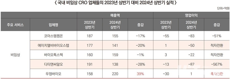 국내 임상 CRO들의 실적이 엇갈린 것과 달리, 비임상 CRO 업계는 대부분 실적 부진을 면치 못했다. 주요 코스닥 상장사 5개 업체 중 코아스템켐온, 에이치엘비바이오스텝, 바이오톡스텍, 디티앤씨알오는 올해 상반기 매출과 영업이익이 모두 작년 동기 대비 감소했으며, 증가세를 보인 곳은 우정바이오 한 곳에 그쳤다.
