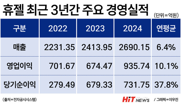 물론 3년간 주요 경영실적으로 보면 휴젤의 성장세는 매우 높은 수준이다. 개별재무재표 기준 매출은 2024년 2690억원으로 전년 2413억원, 2022년 2231억원에서 매년 200억원 단위로 점프하고 있다. 연평균 6.4% 수준 성장률이다.