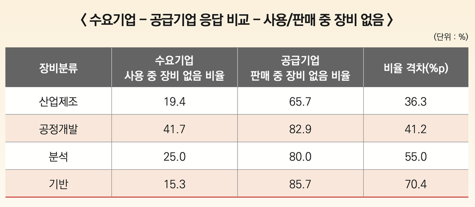 제품 수요와 공급 불균형도 큰 문제였다. 기계연이 조사한 72개 수요기업, 35개 공급기업의 설문 결과를 보면 2021년 기준 '사용 중인 장비 없음'과 '판매 중인 장비 없음'의 격차가 최대 70%에 달하는 것으로 나온다. 국내 기업이 만들지 않는 장비는 결국 해외에서 직접 구매해야 한다. 주사제나 점안제 등을 비롯한 특수 제형 제품 중 국내 제조사가 없어 해외에서의 기준에 맞는 제품을 들여와야 한다는 속사정을 실감했다.