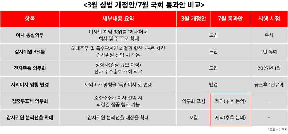 지난 3일 상법 개정안이 국회 본회의를 통과했다. 지난 3월 윤석열 전 대통령이 거부권을 행사했을 당시와 비교해보면, 주요 항목들은 유사하나 일부 차이가 존재한다.