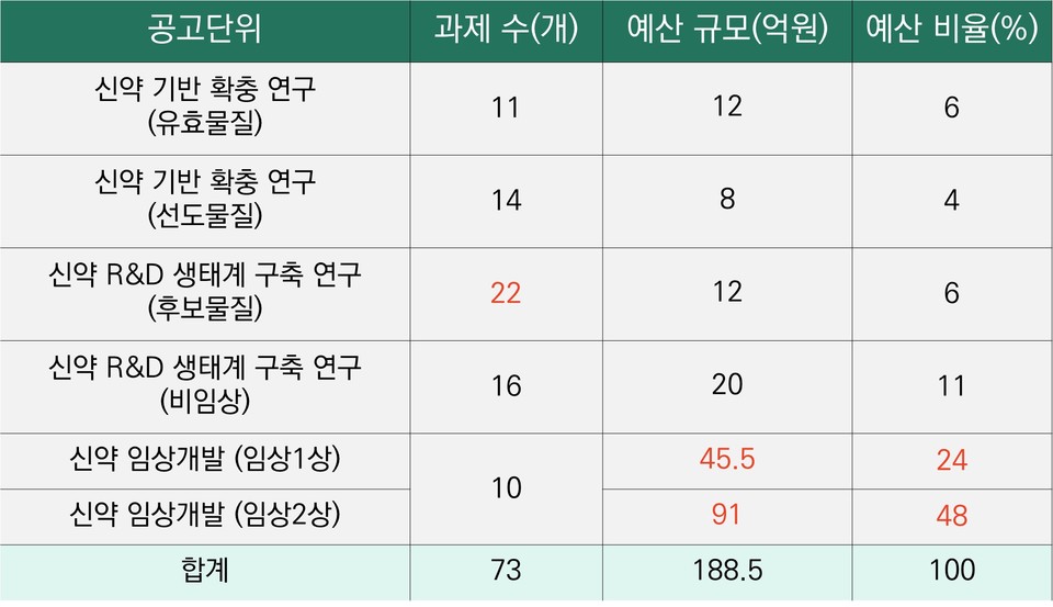 선정된 73개 과제 중 후보물질 단계가 22개로 가장 많았고, 유효물질(11개), 선도물질(14개), 비임상(16개), 임상(10개) 단계가 뒤를 이었다. 과제별 지원 규모는 최소 8억원에서 최대 91억원까지 다양하다.