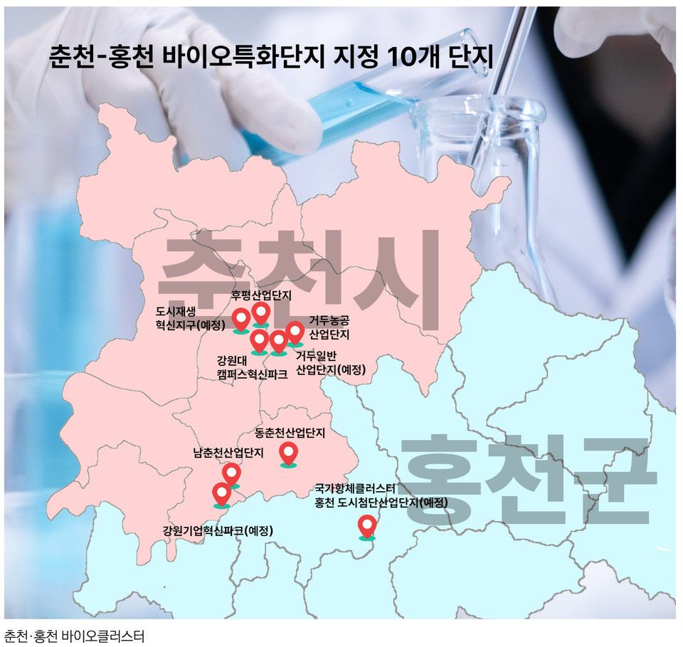 현재 춘천과 홍천 바이오특화단지에 선정된 곳은 기 조성 단지 5곳, 조성중인 2곳, 향후 지어질 3곳이다. 현재 조성된 곳이 강원도 최고(最古)의 산업단지인 후평일반산업단지와 거두농공단지, 동춘천산단, 남춘천산단, 홍천북방농공단지 등이다. 여기에 앞서 방문한 캠퍼스 혁신파크와 홍천국가항체클러스터이고 기업혁신파크, 거두농공단지 옆 일반산단과 캠프페이지 내 도시재생혁신지구를 포함하면 총 10곳의 단지가 춘천 및 홍천의 바이오산업을 떠받친다.