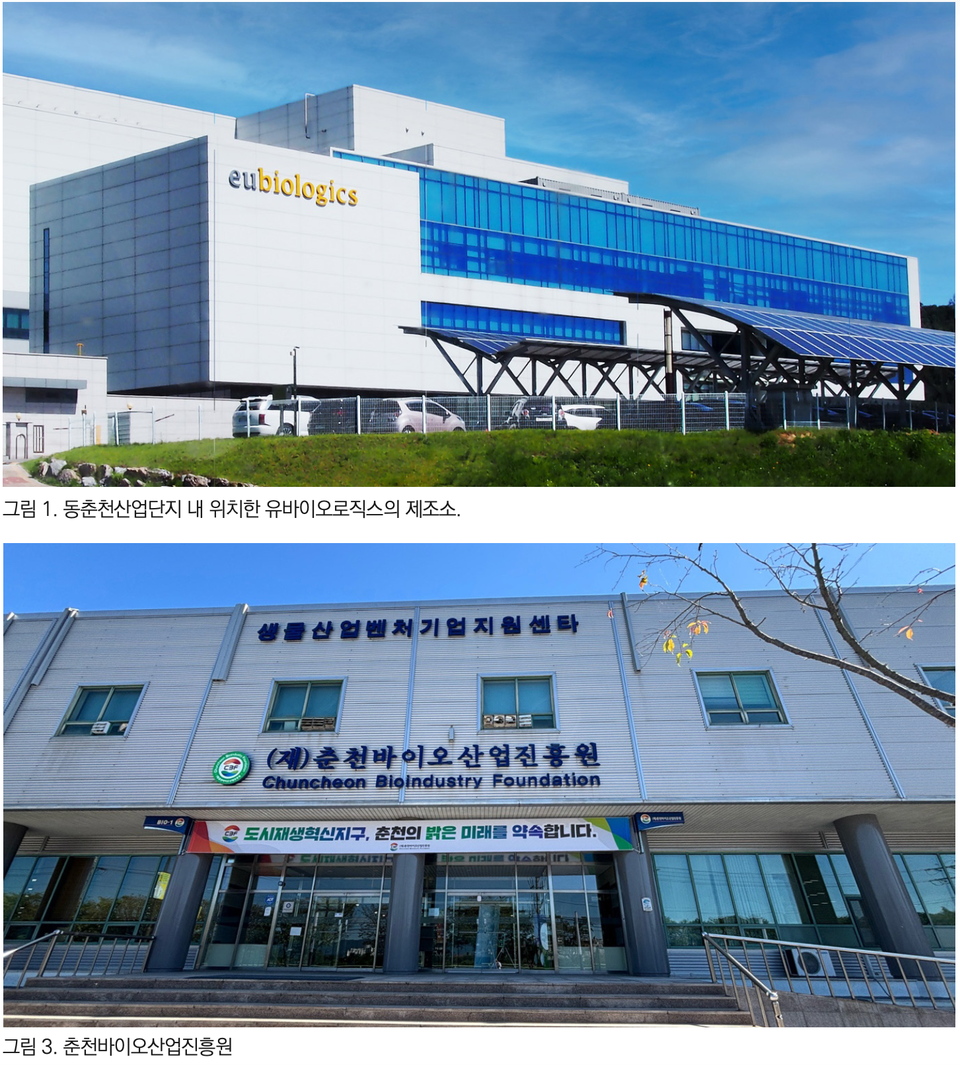 거두농공단지에서 홍천 쪽으로 차로 이동하면 30분 가량 거리에 동춘천산업단지도 있다. 여기에 입주한 제약바이오기업숫자는 적지만 이름만 들으면 알만한 기업들이다. 단지 팻말 앞에 거대한 규모의 유바이오로직스 공장이 있다. 맞은편에는 외국인 로만 베르니두브 대표가 창업한 에스테틱 기업 코루파마의 제조소 등도 위치해 있다.