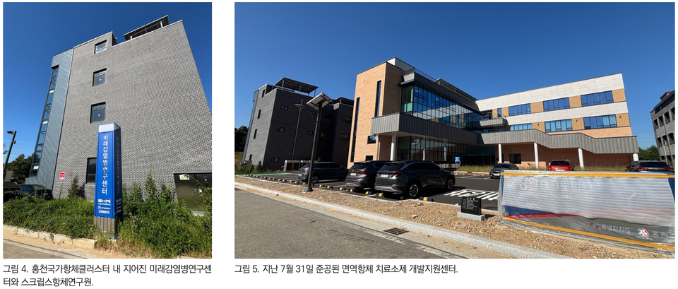 마지막으로 이동한 곳은 홍천에 위치한 국가항체클러스터 부지다. 7월 준공된 건물 세 곳에는 강원테크노파크 사무실과 중화항체 치료제 개발 지원센터, 면역항체 치료소재 개발지원센터, 미래감염병 신속 대응 연구센터와 한국스크립스연구원이 현판을 걸었다. 앞으로 공원, 항체산업비즈니스센터, 지원센터를 비롯해 근무자를 위한 행복주택까지 마련된다.