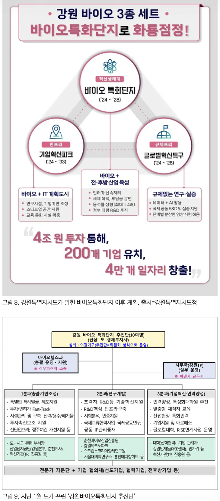 도는 이와 함께 올해 1월 경제부지사를 단장으로 하는 '강원 바이오 특화단지 추진단'을 출범해 관련 정책을 심의하고 총괄 기반 조성, 연구개발, 기업 혁신 및 인력 양성 등 각 분야의 구체적인 계획을 수립, 추진하는 별도의 기구를 운영한다는 계획이다. 중앙정부 지원과 더불어 기존 지역이 쌓아온 생태계를 더욱 단단하게 꾸리겠다는 것이다.