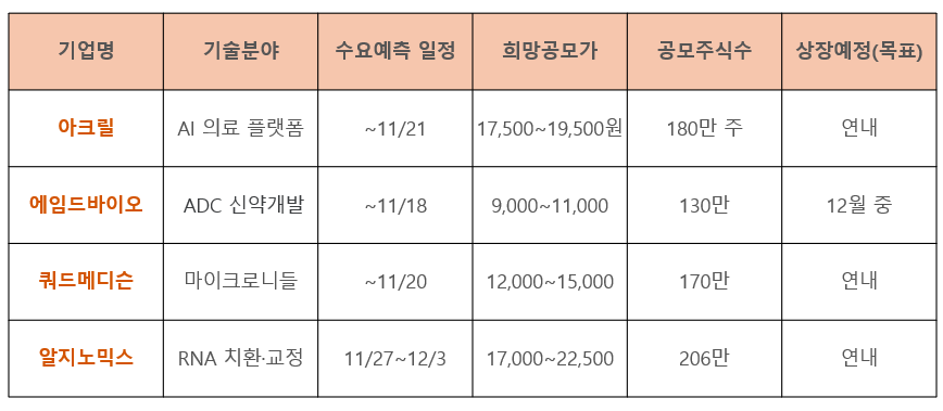 17일 업계에 따르면 아크릴은 지난달 증권신고서를 제출하고 이달 기관 수요예측에 나선다. 에임드바이오는 글로벌 기술수출 성과를 기반으로 이번 주까지 수요예측을 진행하며, 연말 코스닥 입성을 준비 중이다. 쿼드메디슨은 마이크로니들 플랫폼을 앞세워 수요예측을 앞두고 상장 절차에 속도를 내고 있고, 알지노믹스는 RNA 치환·교정 기술을 무기로 다음 주 기관 수요예측에 돌입한다.