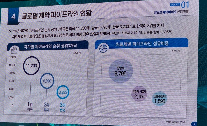 보산진이 제시한 자료에 따르면 한국이 보유한 파이프라인은 3233개로 미국(1만1200)과 중국(6098)에 이어 세 번째고, 치료제별로는 항암제와 유전자치료제가 비교적 높은 비중을 차지한다. 전 팀장은 "시장 크기가 아닌 혁신역량 지표에서 한국은 세계 최상위권"이라며 "치료 패러다임을 바꿀 후보군이 계속해서 확장되는 구도"라고 말했다.