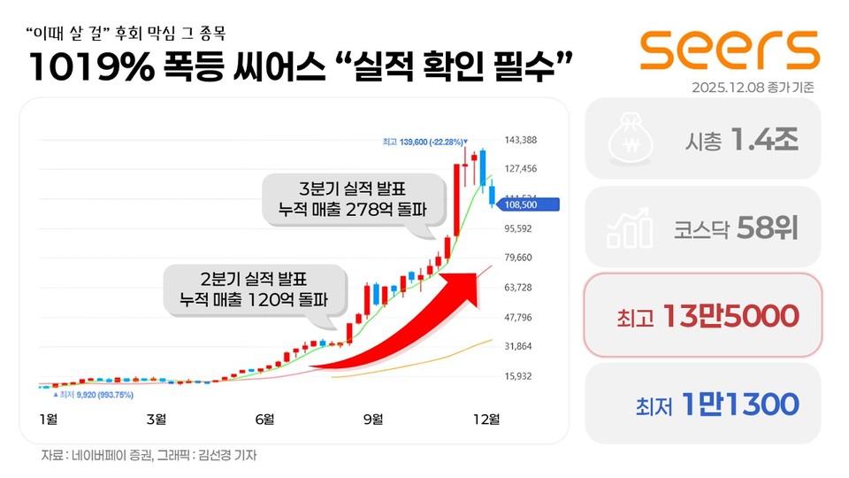 한 해 동안 무려 1019%의 상승률(최저가 대비 종가, 25.12.08 기준)을 기록한 씨어스테크놀로지는 확실한 '숫자의 힘'을 보여줬다. 회사는 지난 8월 반기 실적 공시를 통해 상반기 누적 매출액 120억원, 영업이익 9억원으로 흑자 전환을 발표했고, 3분기에는 매출액이 전년 동기 대비 1500% 증가한 157억원, 영업이익 67억원으로 누적 매출 278억원을 기록하며 성장세에 불을 붙였다.