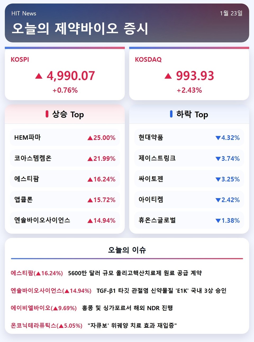 HEM파마(+25.00%), 코아스템켐온(+21.99%), 에스티팜(+16.24%), 앱클론(+15.72%), 엔솔바이오사이언스(+14.94%)
