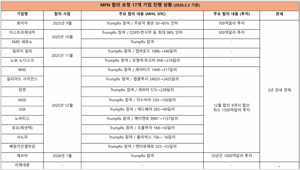한편 리제네론은 아직 공식 합의가 발표되지 않은 유일한 주요 기업으로 남았다. 다만 업계에 따르면 리제네론 역시 정부와 MFN 약가 적용과 투자 조건을 둘러싼 협의를 이어가고 있는 것으로 전해져 조만간 합의 여부가 윤곽을 드러낼 가능성도 거론되고 있다.