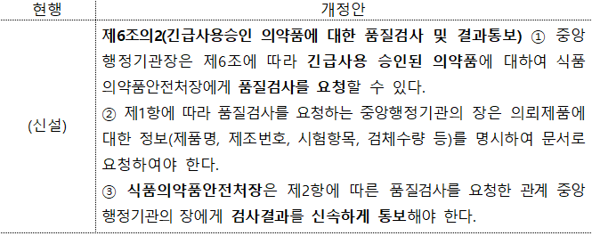 개정안은 "중앙행정기관장은 제6조에 따라 긴급사용 승인된 의약품에 대하여 식품의약품안전처장에게 품질검사를 요청할 수 있다"고 명시됐다.