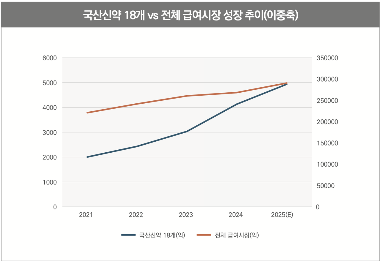 이 4가지 유형은 이번 개편의 계단식 약가와 다른 궤에 놓여있다. 실제 40호가 넘어선 국산신약 가운데 조사 데이터 내 시판 중인 품목 내 이 중 2025년 기준 급여 매출 100억원 이상인 품목은 18개다. 아이큐비아 데이터 기준 이 18개 품목의 2025년 합산 급여 유통액은 약 8240억원이다. 2021년 대비 4년간 연평균 성장률은 15.3%에 달한다. 전체 급여 시장 성장률 7.1%의 두 배를 웃돈다. 이 중에서도 특허존속 기간이 2028년 이후인 품목은 성분 기준 12개다.