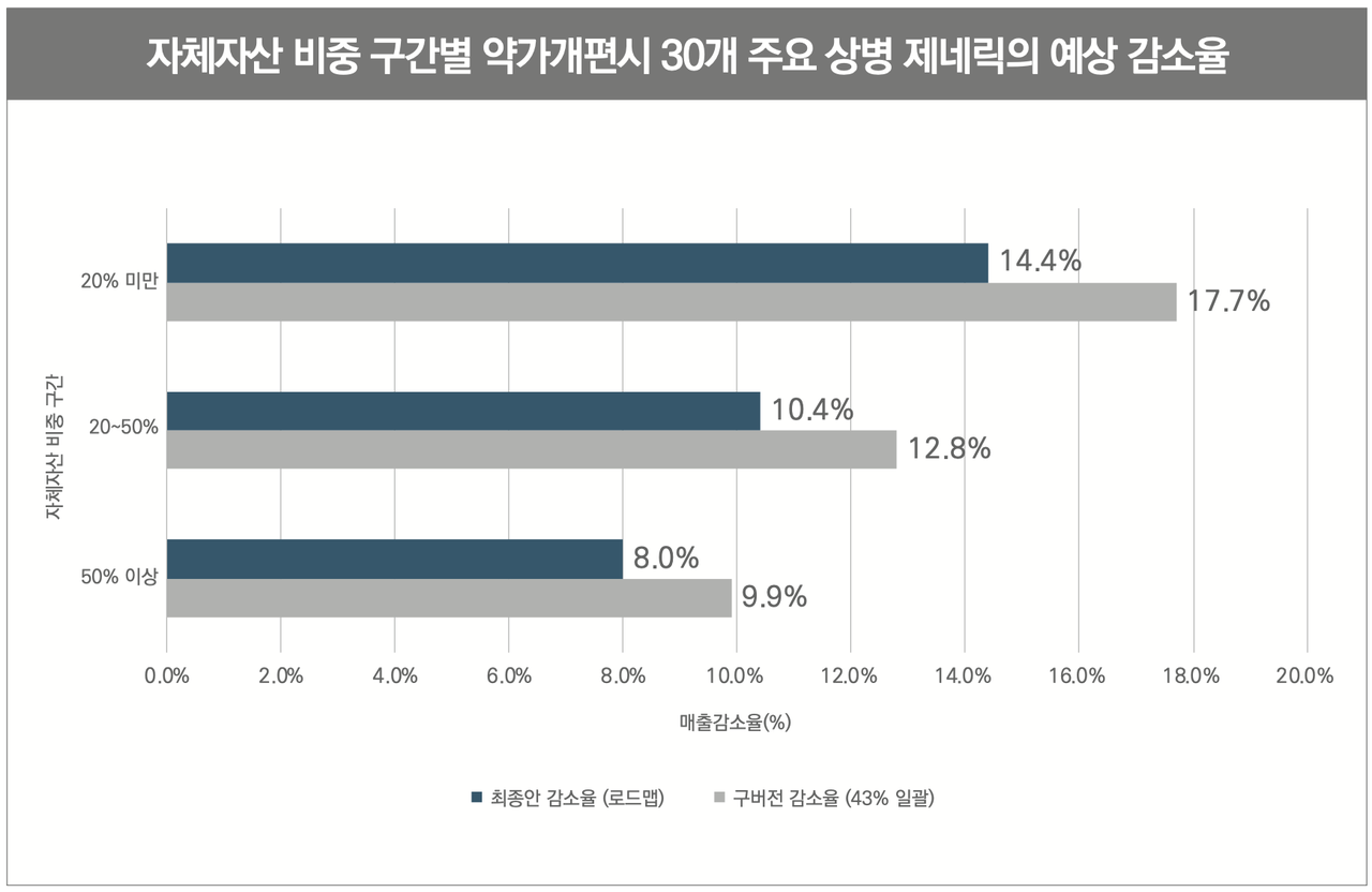 수치로 정리하면 평균적으로 차이는 있지만 국산신약+개량신약+독자복합제 합산 매출 비중이 전체 급여 포트폴리오의 40% 이상인 기업군은 이번 약가개편 시뮬레이션 기준 매출 감소폭이 전체 평균(16.0%) 대비 절반 수준인 7~9%대에 그친다. 반면 이 비중이 20% 미만인 기업군은 평균 이상의 타격을 받는다.